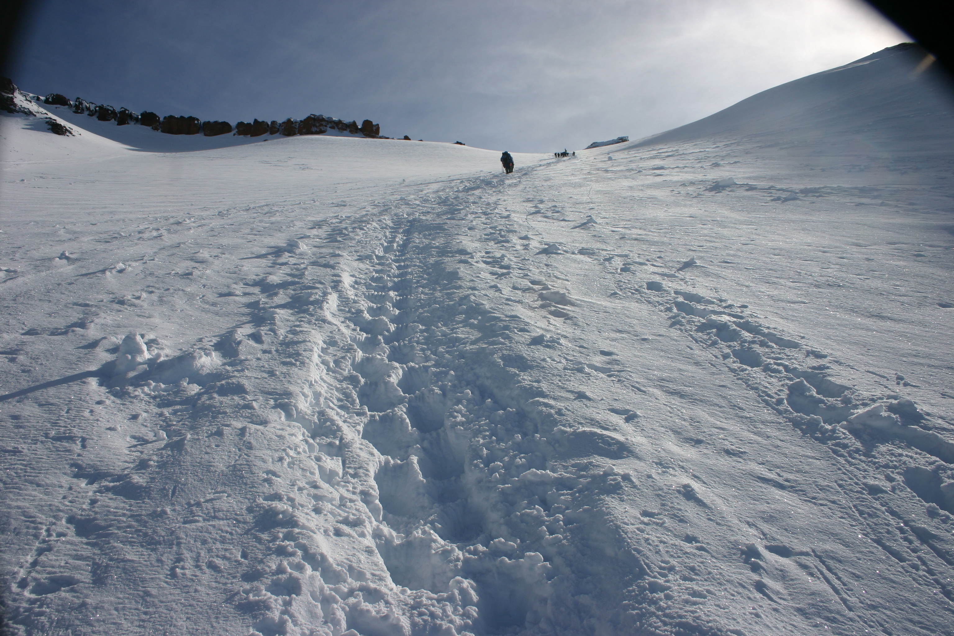 | Seeing the summit for the first (or second or third or fourth) time is exhilarating, but getting there is still no simple feat in the atmosphere above 14, 000', as there are still many footsteps to be taken to get to the top. |